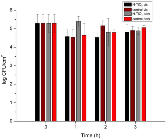 It is noteworthy that, in some cases, there was a tendency for the N-TiO2 NPs to attract greater biofilm populations. This occurred both under visible-light radiation and under no irradiation. For example, in the first hour of irradiation, the biofilm population was slightly higher when N-TiO2 was present, compared with the control specimen in the photoreactor. Similar results were obtained for the biofilms left in the dark for 1 h. The reason for this was that the NPs, due to their morphology and small size (i.e., higher surface area), offered a wider space for the biofilms to grow on. Moreover, they created “trapping” sites that worked as shelters for the cells.