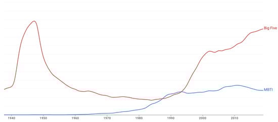 The trait-based approach of the Big Five model as well as its empirical support, cross-cultural applicability and reliability [8,9,10] have caused it to be a popular choice in scientific circles, with a majority of research on personality computing centred around it. Several studies have additionally contributed to this preference by confirming its validity [11,12], while the MBTI has often been criticised for lacking this evidence [13,14,15,16]. If we consider the data that is publicly available through https://books.google.com/ngrams (accessed on 28 March 2023), we can note that, although both the Big Five and MBTI personality models have seen an increase in popularity within the last couple of decades, the “Big Five” n-gram appears significantly more frequently when it comes to book titles (shown in Figure 1).