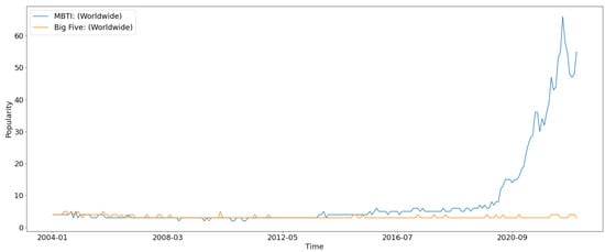 On the other hand, if we use the frequency with which people search for a particular personality model using the Google (https://www.google.com/ (accessed on 28 March 2023)) search engine as an indicator of interest, we note that the preference seems to be different from that in academia. When observing the data available through the Google Trends API (https://trends.google.com/home (accessed on 28 March 2023)), we notice that the MBTI has drawn much more interest than the Big Five, especially in the last several years (depicted in Figure 2). This can be attributed to the fact that the way in which MBTI assigns personality (using a four-letter acronym) is easier to interpret and report for the non-psychological population, causing it to be more prevalent on social media platforms and, thus, attract greater attention.