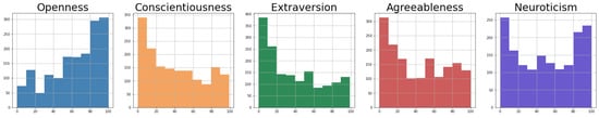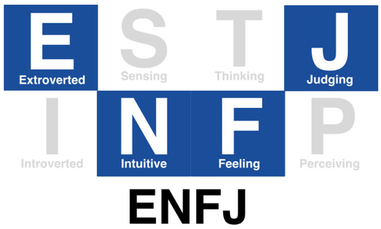 The Myers–Briggs Type Indicator [33], or MBTI for short, is another very popular personality evaluation tool. The Myers–Briggs Company (https://www.themyersbriggs.com/en-US/Connect-with-us/Blog/2018/October/MBTI-Facts–Common-Criticisms (accessed on 28 March 2023), which is in charge of distributing the evaluation test, has stated that millions of people use the test annually in over 100 countries.