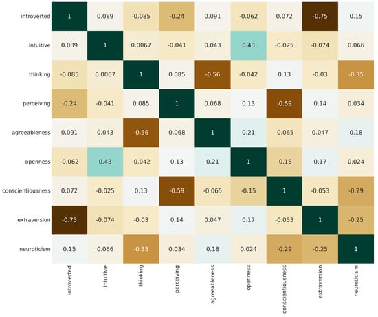 - Radisavljević, D.; Batalo, B.; Rzepka, R.; Araki, K. Myers-Briggs Type Indicator and the Big Five Model—How Our Personality Affects Language Use. In Proceedings of the IEEE CSDE 2022, Gold Coast, Australia, 18–20 December 2022. [Google Scholar]