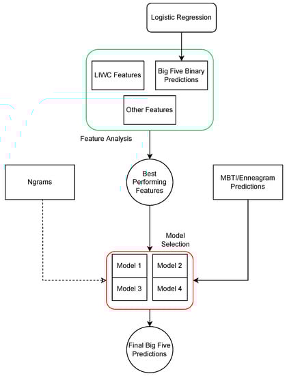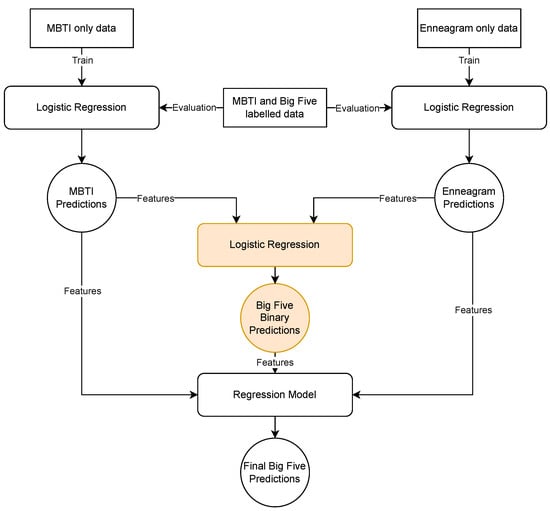 An interesting study comparing multiple personality models is that of Celli and Lepri [60], who compared the effectiveness of predicting labels for the MBTI and the Big Five model on a dataset originating from the social media platform Twitter (https://twitter.com/ (accessed on 28 March 2023)). They treated the problem as nine separate binary classification tasks, five of which were for classifying Big Five traits and four for the MBTI types. For the model architecture, they used a combination of n-gram, LIWC dimensions and metadata features for Support Vector Machine and another meta-classifier based on the work of Thornton et al. [61]. While their approach offered novel insight into the difference in effectiveness of the automatic personality recognition task for two different models, the relationship between models themselves was left unexplored.