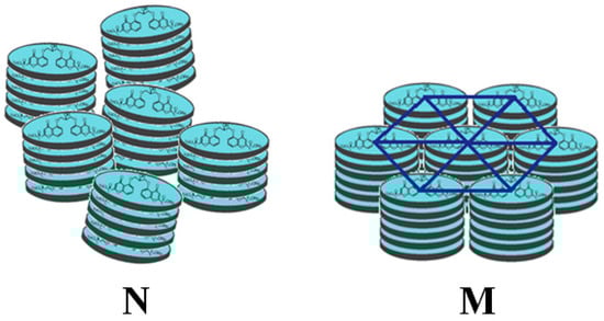 Scheme of the N (left) and M phases (right) for a chromonic liquid crystal.