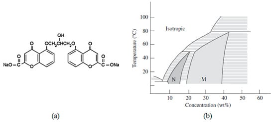 Figure 2a shows the molecular structure of disodium chromoglycate (DSCG), whose phase diagram in a deionized water solution is reported Figure 2b. DSCG is the disodium salt of dibasic acid: 1,3-bis (2-carboxychromon-5-yloxy)-2-hydroxypropane [25]. Its crystals are an interstitial solid solution, with water as the interstitial component. In the solution, the unit cell expands to accommodate up to approx. nine water molecules before collapsing to form liquid crystalline hydrates. The DSCG crystals are unique in their degree of reversible water absorption without causing a lattice collapse.
