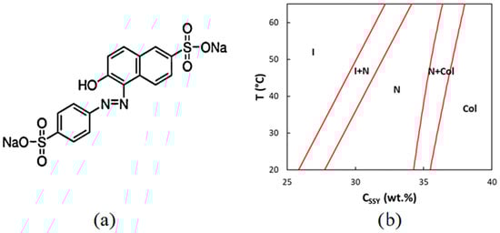 Another well studied chromonic is Sunset Yellow (SSY), Figure 3a shows its molecular formula. SSY can exist in two tautomeric forms [26]: an NH hydrazone form, where the hydrogen resides on the distant nitrogen of the azo bond, and an OH azo-tautomer form, where the hydroxide proton resides on the oxygen in ortho rather than the azo bond. Edwards et al. [27] showed that the NH hydrazonic form prevails. The azo form can produce cis-trans isomers. This change in the isomers occurs when the molecule interacts with light in the 480–500 nm wavelength range. As shown in the phase diagram in Figure 3b, the N phase appears at a concentration of approx. 30–40% by weight, while the hexagonal phase appears at approx. 40–45% by weight.