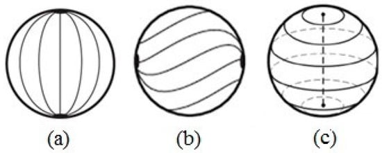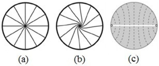 Director’s field schematization for a spherical droplet in homeotropic anchoring conditions: (a) radial drop, (b) twisted radial drop (c) ring defect located on the surface of the drop along one of the two equatorial lines. Reprinted with permission from ref. [36]. Copyright 2011, Springer Nature.