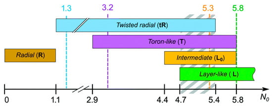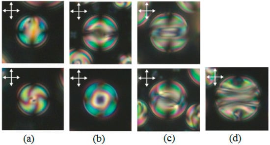 When 2.9 ≤ N0 ≤ 5.8, the toron-like structure is observed. This structure presents the formation of an equatorial circular defect line near the drop surface (Figure 8b). A further increase in the droplet diameter leads to a layer-like L structure with a bipolar distribution of helical axes and with a double twist defect line near the surface (Figure 8d). There is also another structure called the intermediate layer-like structure L0 that shows a number of twists and does not vary as a function of the drop size, having both a fixed geometry and a layered nature (Figure 8c). In some intervals, the different textures are observed simultaneously (Figure 9).