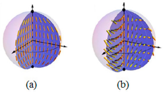 Among them, for the planar anchoring with K11 < K33, a bipolar configuration is typically observed (Figure 5a). In this configuration there are two defects, called boojums, at the poles. The bipolar configuration shows splay distortions near each defect and bend distortions in the rest of the drop.