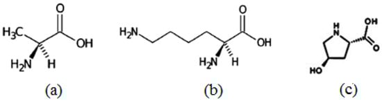 Molecular structure of (a) L-alanine, (b) L-lysine and (c) trans-4-hydroxy-L-proline.