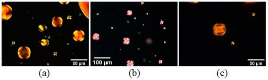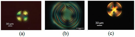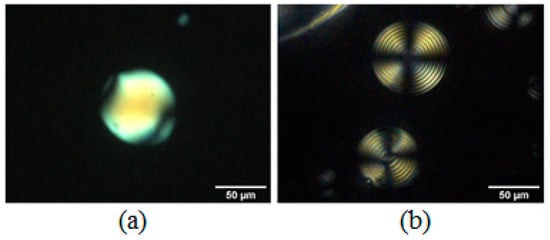 Interestingly, the core of the drop was in the isotropic phase, while the rest of the drop was in the chiral phase, showing a phase separation between the core and the rest of the droplet. The optical microscope image in polarized light (Figure 11) of a droplet exhibiting Frank–Pryce texture showed the characteristic structures of the cholesteric phase, a Maltese cross and a shell with alternating light and dark concentric rings corresponding to the surfaces at a constant refractive index. The concentric spherical packing of the cholesteric layers began at the interface between the microsphere and the immiscible matrix and gradually propagated towards the center of the drop. The center appeared black, highlighting the presence of an isotropic core. The image also showed the presence of a disclination, indicated by a white arrow, and an occasional dislocation, indicated by a red arrow.