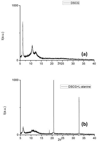 As visible in Figure 15, the DSCG nematic phase, drying slowly, turned into the hexagonal phase that was observed at a small angle. When L-alanine was added, it favored a pair molecule interaction (supramolecular diffraction peaks visible in the XRD pattern). The DSCG hexagonal arrangement was hampered, and supra molecular structures appeared [48].
