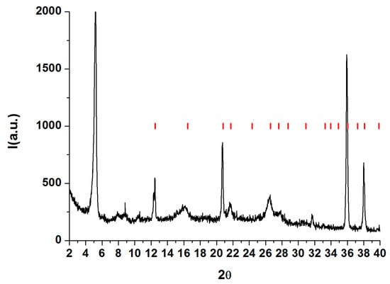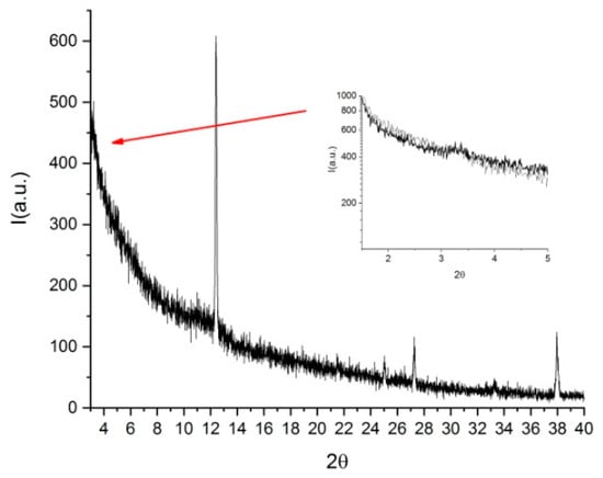 The interaction of SSY with trans-Hyp was completely different. The XRD pattern showed a residual 2D/3D SSY order for low diffraction angles (highlighted by the blue circle), while the small red lines marked the proper peaks of the trans-Hyp [52] (Figure 21).