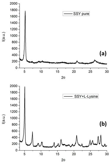 XRD pattern of (a) pure SSY and (b) SSY doped with L-lysine.