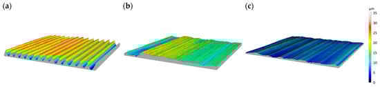 - The conducted tests of the grinding process showed a reduction in the values of the roughness parameters Sa (5.30, 1.12, 0.63 μm), St (31.8, 14.4, 6.72 μm), Sq (6.39, 1.46, 0.81 μm) and Spk (6.16, 0.77, 0. 33 μm), and an increase in the value of the parameter Sds (393, 563, 1203 pks/mm2) on the surface after machining in two stages, first for rough grinding and then for finishing; this was relative to the surface after the shaped milling process.