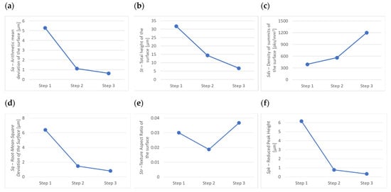 - The value of the Str parameter changed unevenly during the tests. It first decreased during coarse grinding (from a value of 0.03 to 0.0187), and then increased during finishing (from a value of 0.0187 to 0.0367). This is due to the fact that first, a grinding wheel was used that made linear contact with the workpiece during grinding, and then a wheel was used that ground the workpiece with its entire circumference.