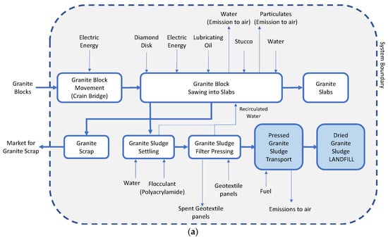 - Mendoza, J.M.F.; Capitano, C.; Peri, G.; Josa, A.; Rieradevall, J.; Gabarrell, X. Environmental management of granite slab production from an industrial ecology standpoint. J. Clean. Prod. 2014, 84, 619–628. [Google Scholar] [CrossRef]