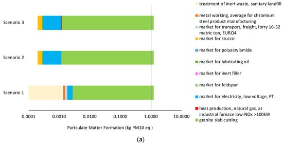 The category of fine particulate matter formation is affected by a percentage of 99.77% in Scenario 1 by stone sawdust formation during granite cutting, which produces approximately 1.3 kg of fine particulates per m2 of granite slab. Small and insignificant environmental credits (<0.5%) are provided by the avoided feldspar or inert filler production considered in Scenarios 2 and 3 in this impact category. The formation of fine particulate matter, besides an environmental issue, must be addressed as a health and safety risk for workers, who are recommended to wear FFP2–3 masks, as well as guarantee the regular cleaning operation of the workspaces and perform regular medical surveillance for respiratory disease control (Figure 4a).