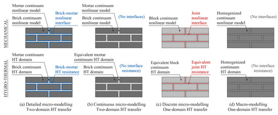 Different finite element computational strategies have been developed for the mechanical analysis of masonry: namely, micro- and macro-modeling approaches [34]. These strategies can be further extended to hygro-thermal analyses as presented in Figure 1. In the case of micro-modeling, which is the focus of this work, the constituent materials (brick units and mortar) and brick–mortar interfaces are modeled separately. On the other hand, macro-modeling approaches assume a homogenized continuum material.
