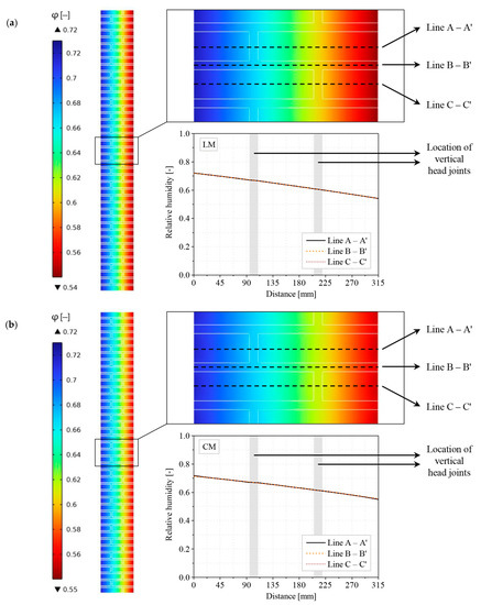 The material properties used for the hygro-thermal simulations are presented in Table 1. Two types of mortar were considered for the analyses: namely, natural hydraulic lime mortar (LM) and cement mortar (CM). Moreover, the brick–mortar interfaces were assumed to have perfect contact for heat transfer, whereas imperfect contact was considered for moisture transport. Thus, a hydraulic resistance 2.0 × 109 m/s was assigned to the brick–mortar interfaces.