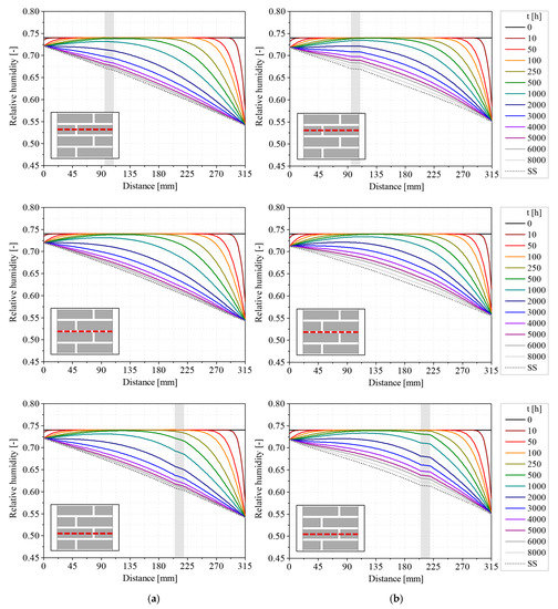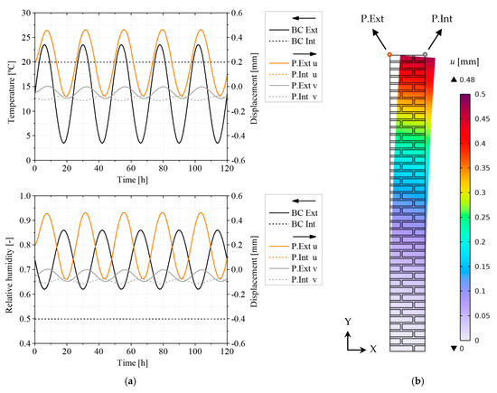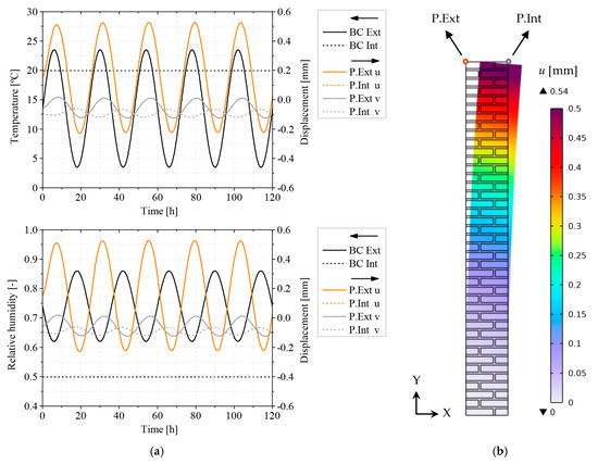 On the contrary, it must be noted that the moisture-induced strains greatly depend on the initial conditions for which the zero-strain configuration is assumed. This behavior is due to the non-linear nature of the coefficient of hygric expansion, . In order to illustrate this, the previously introduced brick wall with natural hydraulic lime mortar can be used as an example. Assuming 0.50, the coefficient of hygric expansion for brick is 11.8 × 10−6 m3/kg. Moreover, for 0.74, the corresponding coefficient for brick is 5.6 × 10−6 m3/kg. Lime mortar presents a similar trend: namely, 7.9 × 10−6 m3/kg and 4.2 × 10−6 m3/kg. Therefore, the coefficients of hygric expansion of both materials double for in comparison with . This implies that if the initial conditions are considered as the free-strain equilibrium, a drying wall () will experience greater deformations than the same material becoming wet (). In conclusion, the initial conditions defined for a hygro-mechanical problem not only determine whether the material experiences swelling or shrinkage but also affect the extent of such deformation. Hence, a careful examination of the initial conditions must be considered for the analysis and interpretation of hygro-mechanical results.