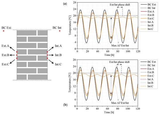 The wall is assumed to be located in Guimarães (Portugal), which has an annual average temperature 13.5 °C and an annual average relative humidity RH 74% [60]. Additionally, the wall is considered to have initial conditions equal to these yearly average values; thus, 13.5 °C and 0.74. One face of the wall is exposed to the exterior, whereas the opposite face is in contact with a conditioned interior space with constant temperature and relative humidity: namely, 20 °C and 50% RH. It must be noted that the presented configuration is rather unusual for a building envelope in contact with a modern habitable interior space since it lacks any type of dedicated moisture barrier or thermal insulation. Nonetheless, this configuration is reasonable for certain historical walls and expedient for the analyses at hand, in which thermal and moisture gradients are of interest. In the case of a masonry wall with good insulation on the interior side, adiabatic boundary conditions could be assumed for the internal face.