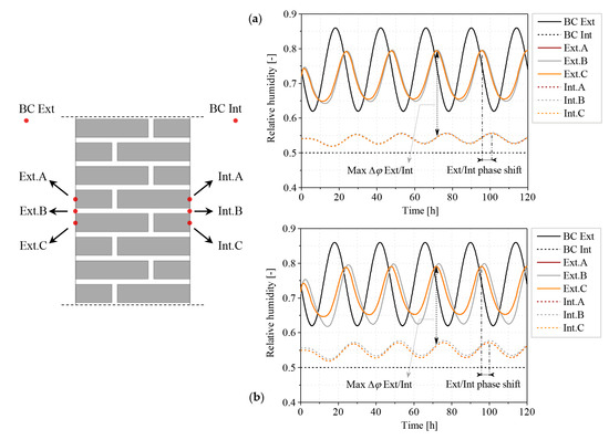 The initial and boundary conditions used for the hygro-thermal simulations of the masonry wall are summarized in Table 2. Neumann boundary conditions were imposed on the external and internal faces of the wall. Therefore, heat and moisture fluxes were defined with commonly accepted values for the convective transfer coefficients. In particular, heat transfer coefficients 25 W/(m2·K) and 8 W/(m2·K) were imposed at the external and internal faces, respectively [61]. It is noted that the heat transfer coefficient selected for the external surface already takes into account the radiative contribution. Furthermore, convective mass transfer coefficients 2.0 × 10−7 s/m and 3.0 × 10−8 s/m were considered for the external and the internal faces of the wall, respectively [61].