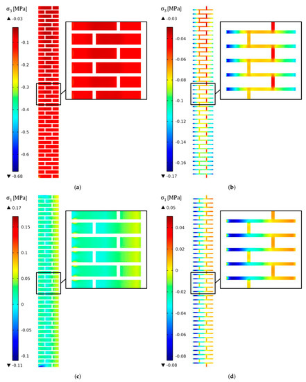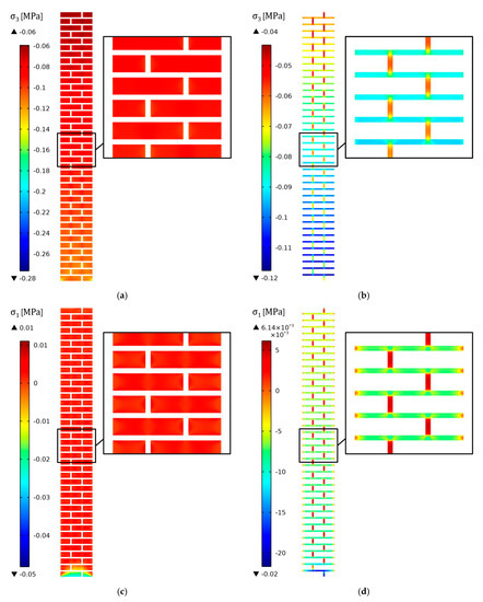 Hygro-thermo-mechanical analysis of the three-wythe brick masonry wall with natural hydraulic lime mortar. Principal stress distribution obtained for the hygro-thermo-mechanical case: minimum principal stress, [MPa], in (a) bricks and (b) mortar joints; maximum principal stress, [MPa], in (c) bricks and (d) mortar joints.