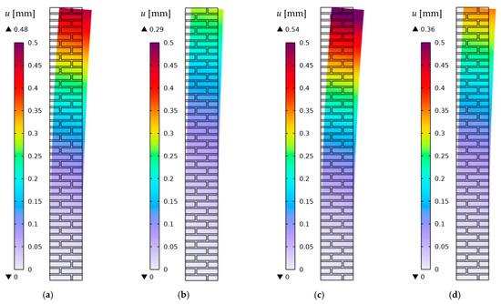 Hygro-thermo-mechanical analysis of the studied three-wythe brick masonry wall: maximum displacement obtained for the wall with natural hydraulic lime mortar assuming initial conditions equal to (a) external conditions and (b) internal conditions; maximum displacement for the wall with cement mortar assuming initial conditions equal to (c) external conditions and (d) internal conditions.