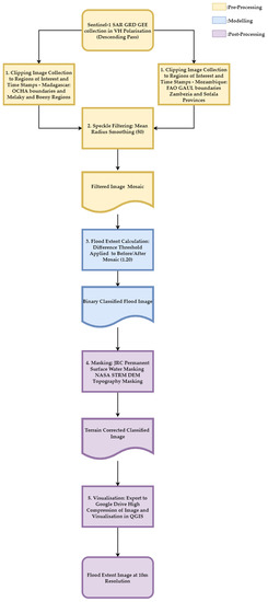 Flood model workflow. Adapted from UN-SPIDER radar-based recommended practice. All code can be found on GitHub.