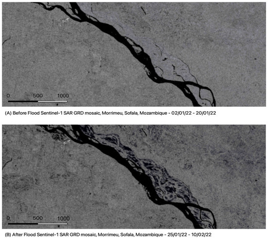 Before (A) vs. after (B) Sentinel-1 SAR mosaic of the Morrimeu National Reserve Area in Sofala, Mozambique. Areas on the eastern side of the Zambezi River can be seen to have been flooded, with stagnant water bodies caught between drier patches of land.