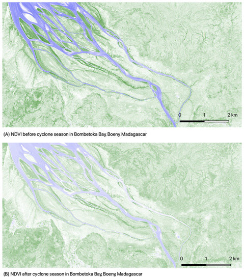 In Madagascar, in the Boeny region, mangrove areas displayed more degradation than the Melaky region and Mozambique overall. The majority of changes in NDVI could be seen in Bombetoka Bay, which flows into the Mozambique Channel, with differences in NDVI of 0.2–0.3. As can be seen in Figure 5, the comparison of this mangrove area shows a lower NDVI overall immediately after the cyclone season compared to before the season. Some stagnant bodies of water also appear to have been created south-west of Bombetoka Bay.