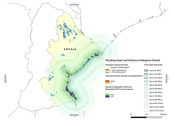 Flooding impact of TC Ana on Local Population over Sofala, Mozambique as a Measure of Distance from Healthy Mangrove Forests. In Sofala’s healthy mangrove ecosystem before compared to after the cyclone season (<0.1 changes in NDVI), the majority of people exposed to flooding occurred beyond 100 km away from the coast, with the closest vulnerable people at least 40 km away from the mangrove area. Despite there being some areas of high population density, depicted in red, in the close vicinity of the mangrove areas (20 km), these populations seemed to remain unaffected by flooding.