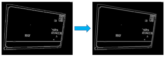 After the image is binarized, Gaussian smoothing is applied to enhance the capability of the Probabilistic Hough Transform to identify the longer line segments. This is achieved by connecting short line segments to form a longer straight line (see Figure 6). In this research, we employ the Probabilistic Hough Transform method to identify the double lines of the preprocessed image. By utilizing these line segments, it is possible to calculate the corner coordinates of the Cartesian coordinate space for the thumbnail image. Then, the desired corner point of the original image is obtained by multiplying the value of the corner coordinates by ten (see Figure 5b). Once the corner coordinates of the nameplate have been identified, a perspective transformation matrix is applied to the region to convert it into a standardized rectangular shape (see Figure 7a).