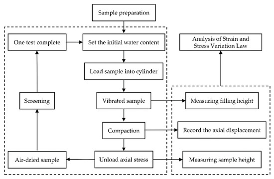 According to the experimental scheme set above, prepare test samples with the specified water content, and fill them all into the steel cylinder. Place a steel bar with a diameter of 25mm at the bottom of the cylinder, hold the steel cylinder, and hit the ground alternately 25 times on both sides. Measure the filling height after vibration, install the compaction device on the testing machine for compaction test, and the testing machine loads at a constant rate of 0.5 kN/s. When the applied axial stress reaches the target value, record the axial displacement of the testing machine throughout the compaction process, and measure the compacted height of the sample after unloading the testing machine. Air-dry the crushed gangue sample after compaction and carry out sieving test after drying. Figure 4 shows the detailed test workflow of the testing process.