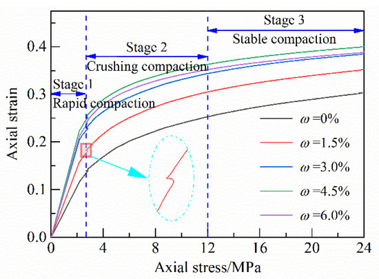 Figure 5 shows the strain–stress curves of the crushed gangue samples compacted from 0 to 24 MPa under 5 different water content conditions. It can be seen from Figure 5 that with the increasing of the axial stress, the axial strain of the samples under different water content conditions generally shows a continuous increasing trend, and the curve increase rate gradually decreases. According to the characteristics of the axial strain–stress curve, the entire confined compaction deformation process of crushed gangue can be divided into three stages: the rapid compaction stage, crushing compaction stage, and stable compaction stage [36,37].