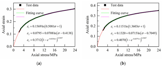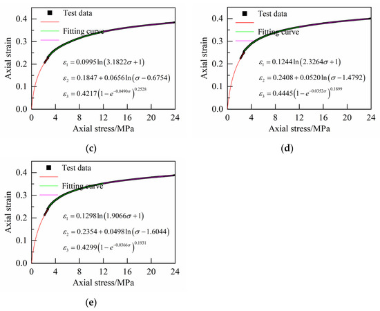 Therefore, in order to better describe the strain–stress laws of the three stages of the confined compaction of crushed gangue, different function forms are adopted to numerically fit the strain–stress curves according to the characteristics of the strain–stress curves in each stage.