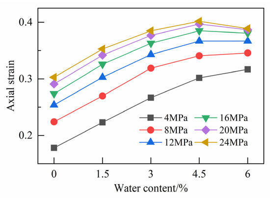 Water content is an important factor affecting the compaction effect of crushed gangue. In order to compare and analyze the influence of the water content on the compaction characteristics, Figure 7 shows the relationship of the axial strain and water content of crushed gangue under different stresses.