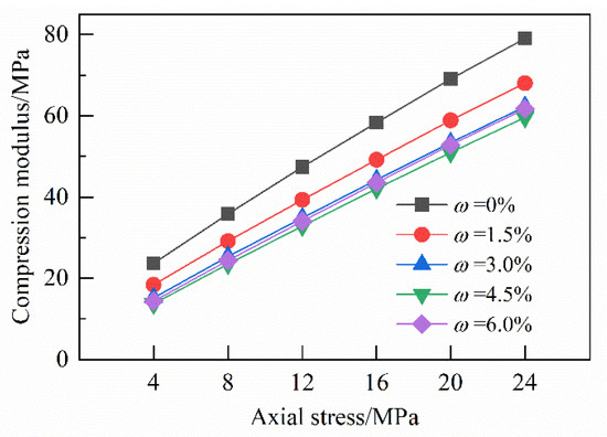 The axial stress and water content are important factors affecting the variation pattern of the compression modulus. It can be seen from Figure 8 that when the axial stress is 4 MPa, the maximum variation in the compression modulus under different water contents is 9.9 MPa. When the axial stress is 24 MPa, the maximum variation in the compression modulus under different water contents is 19.3 MPa. The greater the axial stress, the more obvious the effect of the water content on the compression modulus. Under the same axial stress, the compression modulus of crushed gangue is the largest when the water content is 0, and the variation range is about 23–79 MPa; the compression modulus is the smallest when the water content is 4.5%, and the variation range is about 13.5–60 MPa. With the increase in the water content, the compression modulus shows a trend of first decreasing and then increasing, and the influence of the water content on the compression modulus gradually weakens. This is consistent with the change in the slope of the first-order fitting equation in the table.