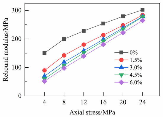 When the axial stress is the same, the rebound modulus of crushed gangue decreases gradually with the increase in the water content. This shows that the higher the water content, the smaller the friction between the gangue particles, and the particles are more prone to slip or roll, resulting in a weaker ability of the crushed gangue sample to resist elastic deformation. When the water content of the crushed gangue is 0%, the variation range of the rebound modulus is 151–302 MPa. When the water content of the crushed gangue is 6.0%, the variation range of the rebound modulus is 52–265 MPa. With the increase in axial stress, the influence of the water content on the rebound modulus of crushed gangue gradually decreases.