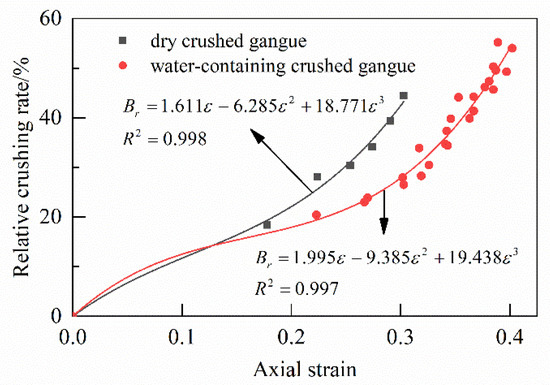 The relative crushing rate of the crushed gangue samples after compaction was calculated according to Equation (7). Figure 11 shows the relationship between the relative crushing rate and axial strain. It can be seen that the relative crushing rate of crushed gangue after compaction increases continuously with the increase in the axial strain, and the increase rate of the relative crushing rate is also gradually increasing. The change law of the relative crushing rate and axial strain is different in dry and water-containing conditions. When the axial strain is the same, the relative crushing rate in the dry conditions is greater than that in the water-containing conditions. The relative crushing rate has a good correlation with axial stress. The data were fitted using a cubic function , and the R-squared of all the fitting results were above 0.99.