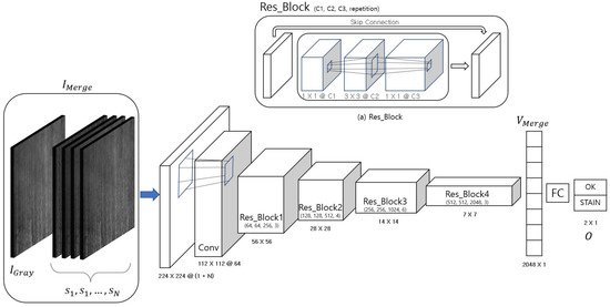 is used as an input to CNN. A feature map with 64 channels was extracted through a convolution layer using a 7 × 7 kernel and sampled at a size of 112 × 112 using max pooling. After that, the feature map was extracted through 4 Res_Blocks, and max pooling was applied between each Res_Block. The numbers in parentheses of Res_Block mean