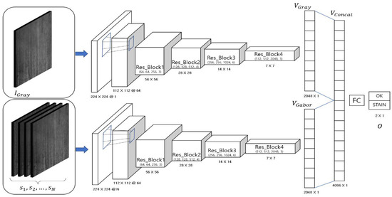 Alternatively, a Dual-stream extraction is composed of two streams. In this study, separate streams for the gray-scale inspection image and the Gabor filter image were designed to solve this decrease in classification accuracy. A CNN independently extracted features for each gray-scale inspection image and the Gabor filter image was constructed through the separate streams.