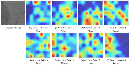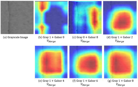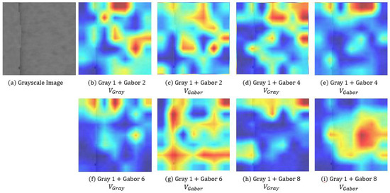 Figure 3b–i are Gabor filter images according to phase, selected for CNN model creation according to their IDM values. The clarity of the boundary difference between the stain defect and the non-defect one depends on the Gabor filter’s phase. In the MT dataset of