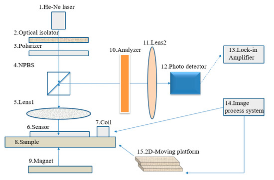 The scanning ECMO imaging defect detection system with a small excitation current and high magnetic field responsivity is built; the system settings are shown in Figure 2. The collimated probe beam is generated by the 2 mW He-Ne laser incident to the polarizer after passing through the optical isolator, and the light polarization direction of the polarizer is set at a 90-degree angle with the analyzer. The nonpolarized beam splitter (NPBS) does not affect the polarization state of the light but only changes the transmission direction of the light. The linearly polarized light from the polarizer passes through the NPBS and is then converged by the Plano convex lens and incident on the sensor. The signal processing system provides an excitation signal of 1 mHz to 1 MHz to the excitation coil. The sample under the excitation coil generates EC. The presence of defects in the sample will affect the distribution of EC, resulting in different secondary magnetic fields, which are superimposed with the excitation magnetic field. The superimposed magnetic field affected by the defect is detected by the MO sensor. An electromagnet or permanent magnet is used to provide a bias magnetic field. When there is no external excitation magnetic field, the probe light passes through the sensor and is reflected by the reflective layer, and it rotates towards 45 degrees under the effect of the bias magnetic field. The 90-degree polarizer and analyzer angle setting can eliminate the influence of reflected light on the sensor surface, and the rotation caused by the bias magnetic field puts the magnetic field detection in a highly sensitive response range. (TmBi)3 (FeGa)5 O12 film is grown on a 0.5 mm-thick Gadolinium Gallium Garnet (GGG) substrate by the liquid phase epitaxy method, and the germanium coating is used as a reflective layer to reflect back the probe light. When passing through the sensor, the polarization direction of the probe light will rotate under the influence of the magnetic field in the vertical sample direction. The reflected light will return to NPBS and be reflected horizontally and land on the analyzer. The light intensity through the analyzer is converted into an electrical signal by the photodetector. The lock-in amplifier filters and amplifies the detected electrical signals. The imaging and signal process system controls the 2D moving platform to move the sample and reads the output of the lock-in amplifier for imaging.
