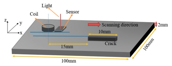 The AC/DC module of COMSOL Multiphysics 5.5 was used to perform finite element simulation on the woven carbon fiber plate. The purpose is to study the effect of crack defects on the surface vertical magnetic field of the sample under EC excitation. The schematic diagram of the simulation model is shown in Figure 3. During measurement, the magneto-optical sensor is placed parallel to the test piece, and the probe light is vertically incident on the magneto-optical sensor. Its Faraday rotation angle is only affected by the magnetic field perpendicular to the surface of the test piece. The sample size is 100 mm long, 100 mm wide, and 2 mm thick, and the size of the sample defect is 10 mm long, 0.4 mm wide, and 2 mm deep. The detection point is 5 mm next to the excitation coil center point. Since the magnetic field at the detection point is mainly affected by the EC between the center of the coil and the detection point, the simulation takes the middle point of these two points to represent the position point of the detection device. We made the lower left corner of the specimen surface the coordinate origin (0, 0, 0), and the coil lifting distance is 0.5 mm. The coil moves from 32.5 mm to 67.5 mm in steps of 1 mm. The coil has 1 mm inner diameter, 2.6 mm outer diameter, 0.8 mm height, 0.05 mm wire diameter, and 140 turns; excitation signal frequency set to 100 kHz, 300 kHz, 600 kHz, and 1 MHz; and current set to 30 mA. Due to the simplification of the distribution of electrical conductivity in the braided structure, the conductivity tensor in Equation (3) above can be simplified into a diagonal form, with the value on the main diagonal set to (10,000, 10,000, 100) S/m.