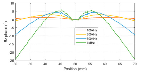 The first step is to simulate with a non-defective sample before defect scanning and obtain the corresponding reference value to normalize the scanning results. Next, the excitation coil is placed on the position (50, 50, 0.5) above the sample without defects. Figure 4 shows the line scan of the phase of the magnetic induction intensity Bz in a vertical direction at z = 0.5, y = 50, and x from 30 to 70. The phase of the vertical magnetic field in the area near the coil on the outside of the coil is affected by the eddy current and first becomes larger and then smaller. Some EC magnetic testing methods are used to detect the change of the superimposed magnetic field inside the excitation coil [20]. Only the superimposed magnetic field outside the excitation coil is considered here. The magnitude of the excitation magnetic field outside the coil is several orders of magnitude smaller than the magnitude of the excitation magnetic field inside the coil, but the difference in the magnitude of the eddy current is not large, so the superimposed magnetic field outside the coil is more affected by the EC [20].