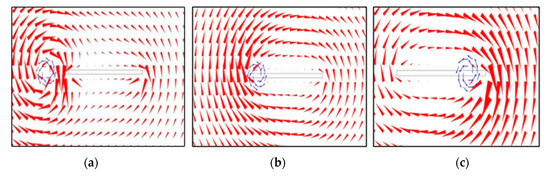 When performing line scanning according to Figure 3, the distribution of EC in the sample is shown in Figure 5. In the figure, blue is the excitation current and red is the EC. When the excitation coil approaches the defect, the EC at the edge of the defect will increase, with the distribution shown in Figure 5a. When the excitation coil moves on the defect, the EC distribution is shown in Figure 5b. At this point, the magnetic field direction of the EC at the detection point is opposite that of Figure 5a. The eddy current distribution when the excitation coil continues to move to the edge of the defect is shown in Figure 5c. At this point, the magnetic field direction generated by the EC at the detection position is consistent with that in Figure 5a, but the extended EC will have a certain counteraction effect, so the impact should be less than that in Figure 5a. There are EC magnetic fields in opposite directions and exciting magnetic fields in the same direction at different positions during scanning, which makes the effect of the EC magnetic fields on the phase of the superimposed magnetic fields opposite. The EC magnetic field at the edge of the defect acts as an obstacle to the change of the excitation magnetic field, and the phase lags behind the excitation magnetic field. The superposition with the excitation magnetic field will make the superimposed magnetic field phase lag behind the excitation magnetic field; that is, the detected magnetic field phase becomes smaller. In the middle of the defect, due to the opposite direction of the EC magnetic field, it is equivalent to a 180-degree transformation of the phase. At this point, the phase is ahead of the excitation magnetic field, so the magnetic field phase after superposition becomes larger.