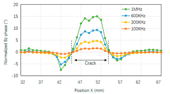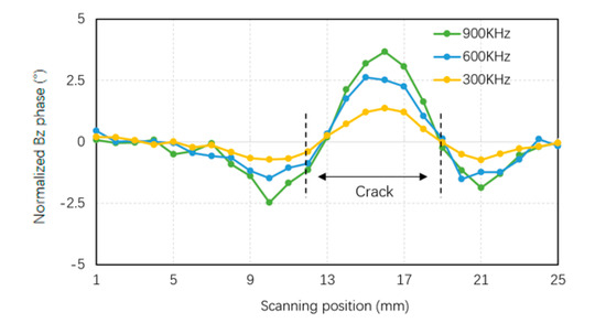 The experimental sample is a 100 mm long, 100 mm wide, and 2 mm thick T300 woven carbon fiber board, which is processed with a crack about 7 mm long, 1 mm wide, and 2 mm deep. Figure 8 shows the test results using the line scanning method analyzed above. In the experiment, 300 kHz 30 mA, 600 kHz 15 mA, and 900 kHz 10 mA excitation signals were used, respectively. The results show that the change law of the magnetic field phase is consistent with the simulation results, and only a small excitation current is required when the frequency is increased. As shown in Figure 8, two black vertical dashed lines indicate both ends of the defect. When the detection mechanism is far from the defect, the detected magnetic field phase is relatively stable. As the detection mechanism gradually approaches the defect, the detected magnetic field phase begins to decrease and then increases. When the detection mechanism reaches the left edge of the defect, the detected magnetic field phase shows a rapid increase trend. When the detection mechanism reaches the center of the defect, the detection value reaches its peak. Then, as the detection mechanism moves away from the center of the defect to the right of the defect, the magnetic field phase begins to decrease rapidly. When the detection mechanism leaves the right edge of the defect, the detected magnetic field phase still maintains a certain downward trend, followed by an upward trend. When the detection mechanism gradually moves away from the defect, it returns to a stable state. This series of phenomena reflects the rationality of the experimental process.