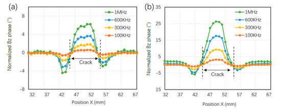 Figure 7a,b are the phase results of line scanning when the detection point is 4 mm and 6 mm away from the center of the excitation coil, respectively. The figure shows that different detection positions have a significant impact on the results’ value, but the basic change law is the same. The farther away from the excitation source, the smaller the excitation magnetic field and the more obvious the phase change of the superimposed magnetic field affected by the eddy current magnetic field.