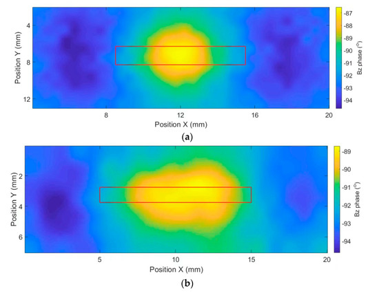 The c scan Bz phase images: (a) approximately 7 mm long surface crack, (b) approximately 10 mm long back crack.